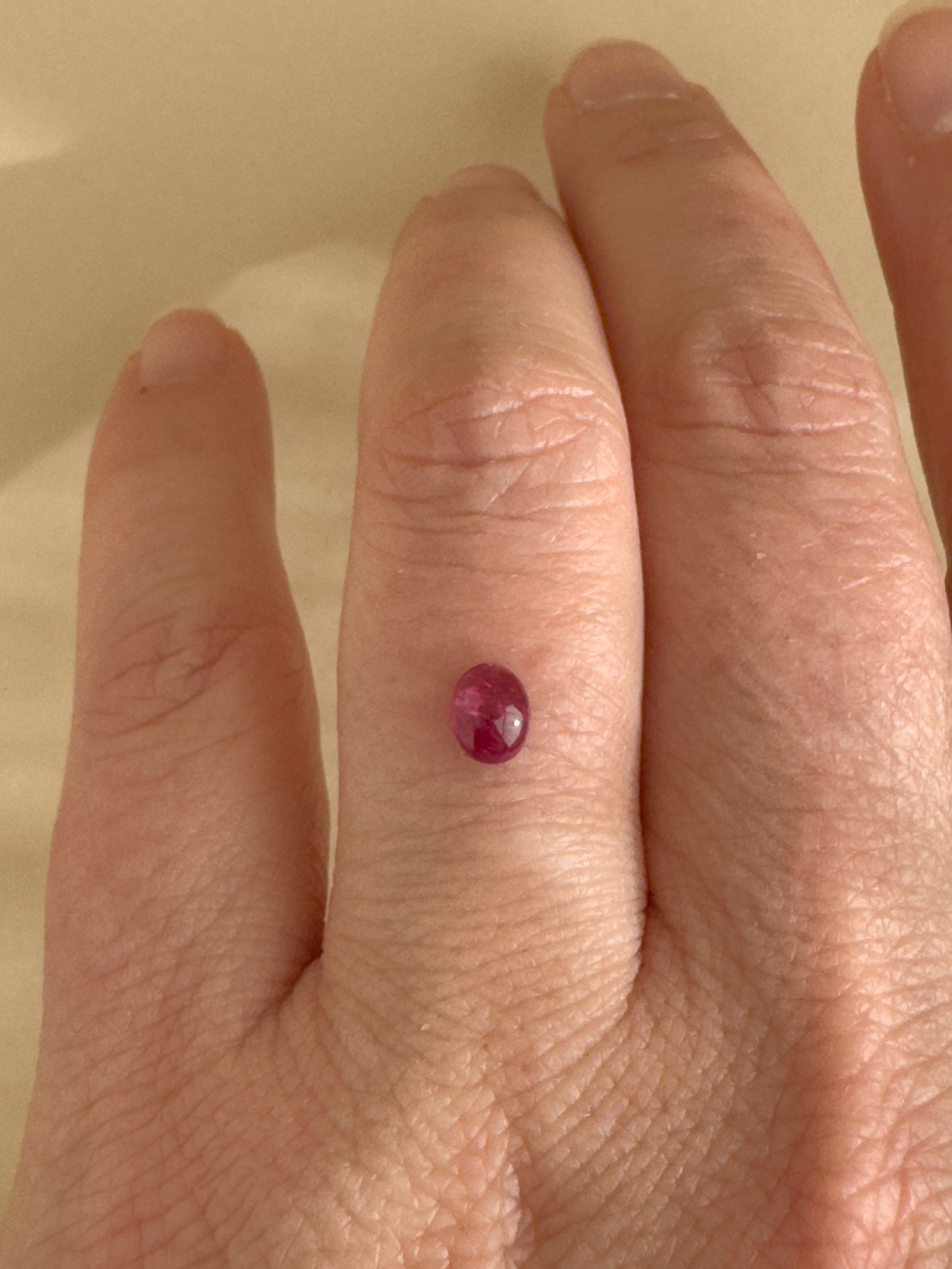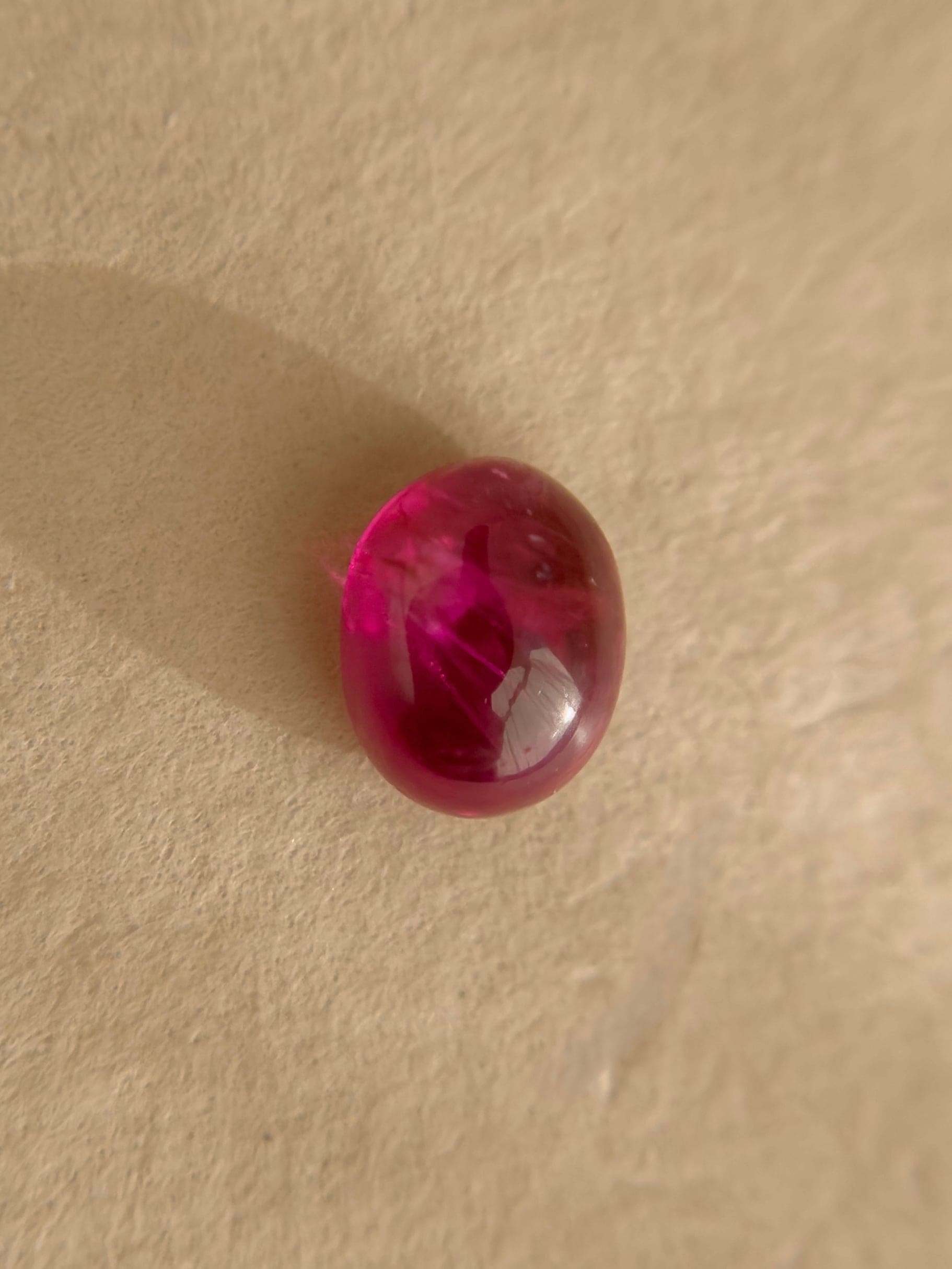 Ember Rose is a study in warmth and restraint — a natural ruby shaped into a smooth oval cabochon that glows rather than sparkles. Its surface holds light softly, like embers beneath ash or petals warmed by the last light of day.